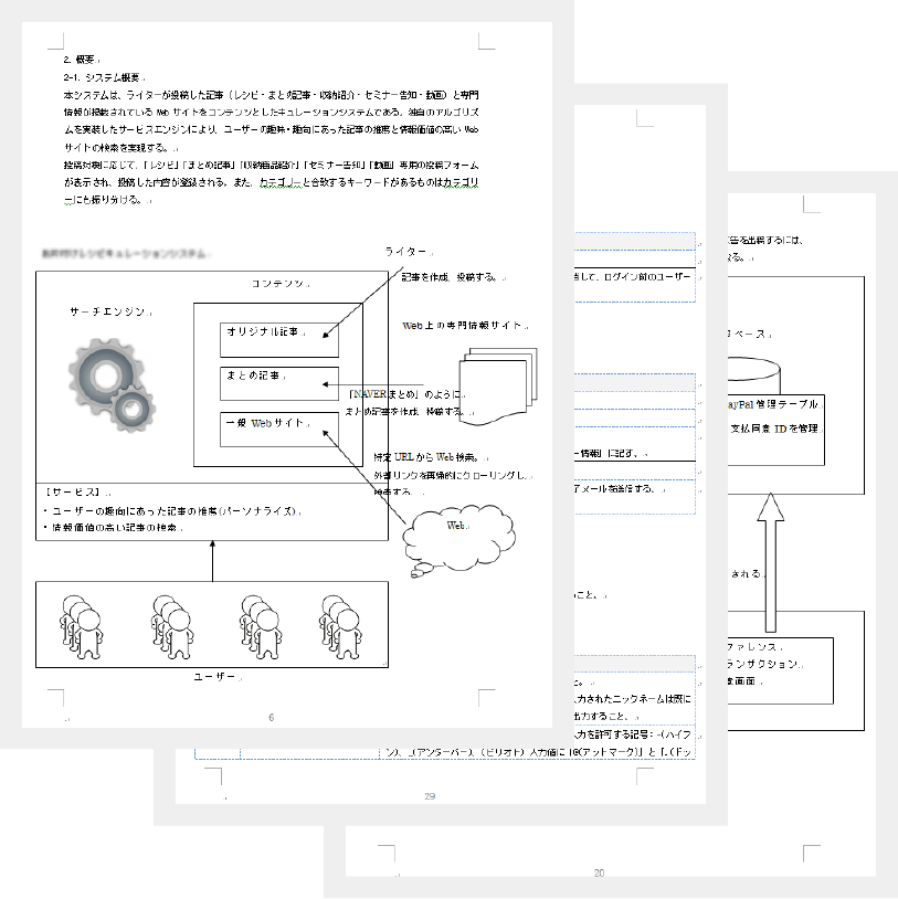事業構想のヒアリングを実施し、資料の内容から構成、レイアウト、文章等を検討し、事業主様・ご担当者様の思いが込められた事業計画書を作成します。